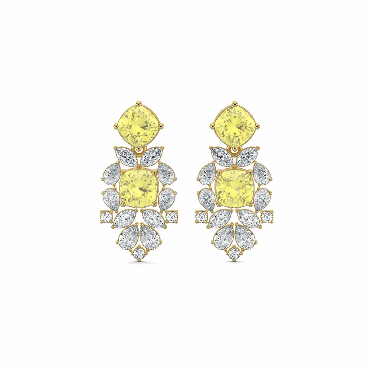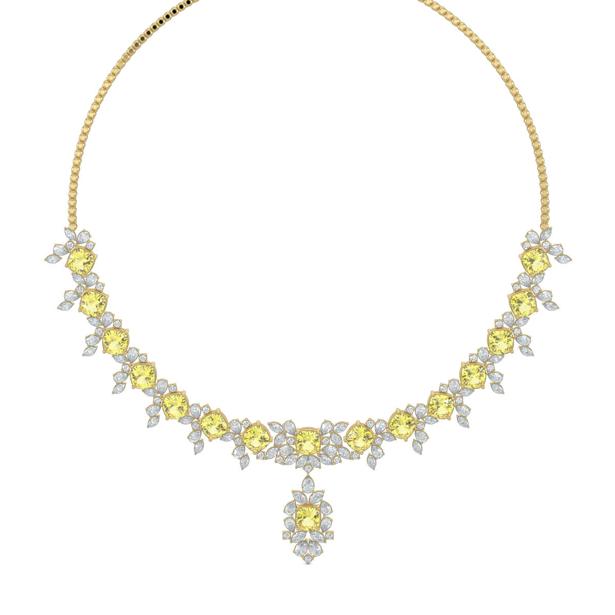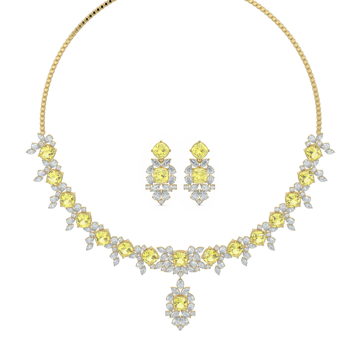 Illuminate your style with the Golden Gleam Necklace Set. This exquisite set features a stunning necklace adorned with 15 vibrant yellow sapphire gemstones, each beautifully surrounded by a cluster of pear, marquise, and round lab-grown diamonds. The matching earrings replicate this captivating design, ensuring you shine from every angle. Crafted with meticulous attention to detail, this set combines the timeless allure of sapphires with the brilliance of eco-friendly diamonds. Perfect for any occasion, the Golden Gleam Necklace Set adds a touch of sophistication and glamour to your everyday style.