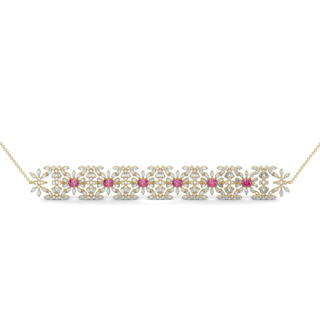 Elevate your casual elegance with the Ruby Choker Necklace Set. This stunning choker features six oval-shaped red rubies, spaced perfectly apart. Between the rubies, clusters of lab-grown baguette, marquise, and round diamonds add a dazzling contrast. The matching earrings have a central oval red ruby surrounded by diamonds, completing the cohesive look. Crafted with care, this set is perfect for casual outings or special occasions, ensuring you sparkle with effortless grace.